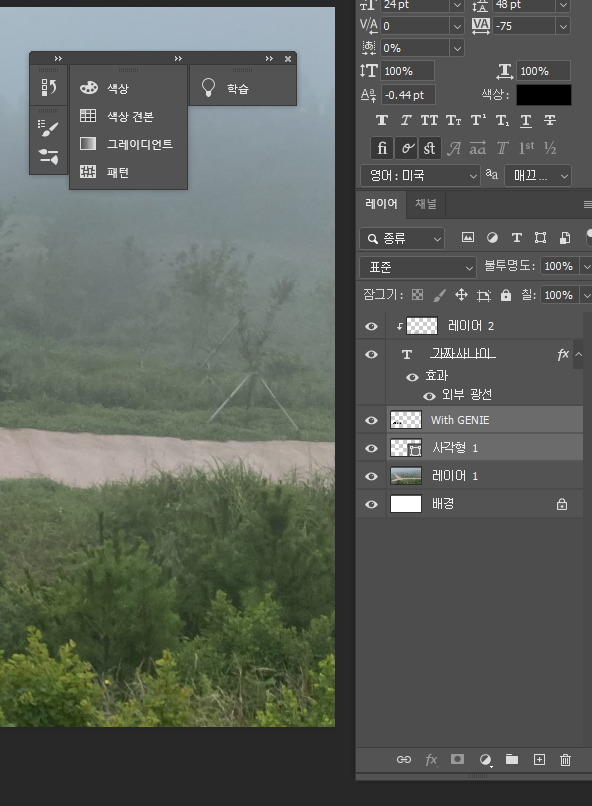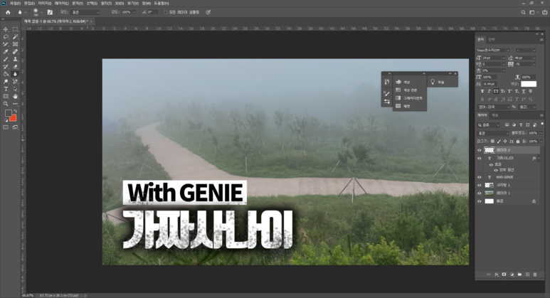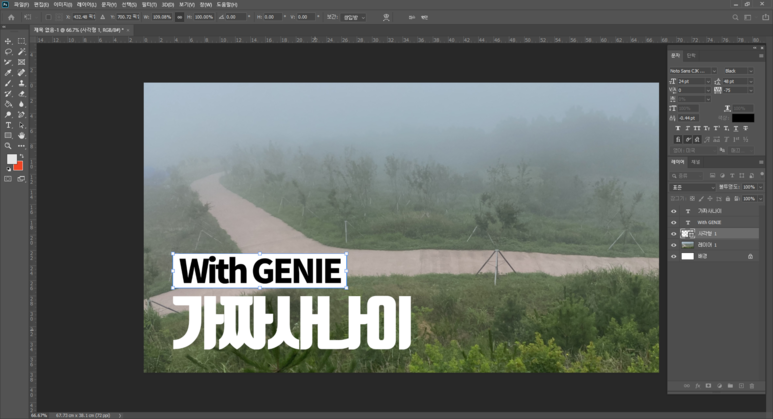 우선 with genie 텍스트 레이어를 마우스 오른쪽버튼을 눌러서 문자 래스터화를 시켜줍니다!
